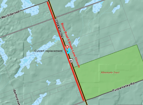 A single lane closure will be in place on Bruce Road 9, north of Colpoys Bay, between Purple Valley Rd and Mar Sideroad on August 19, 2025, from approximately 6:30 a.m. until 5 p.m. for culvert replacement, weather permitting.