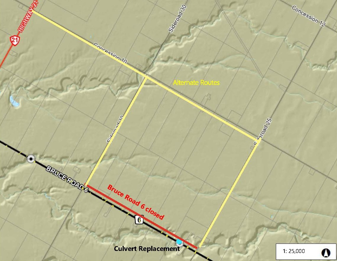 Bruce Road 6 between Sideroad 25 and Sideroad 30, west of Ripley, will be closed for culvert replacement on Wednesday, August 20, 2025, from approximately 6:30 a.m. until 5 p.m., weather permitting.