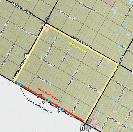 Bruce Road 86 between Bruce Road 7 and the west end town limits of Lucknow will be closed for culvert replacement from July 28 to July 31, 2025.