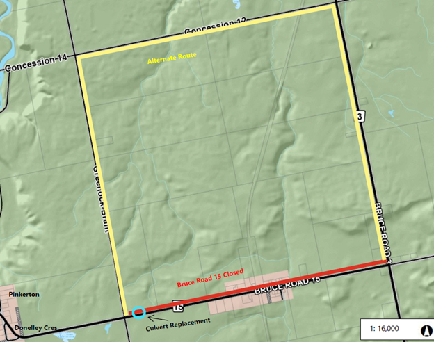 Bruce Road 15 between Greenock Brant and Bruce Road 3 will be closed for culvert replacement on Friday, August 8, 2025, from approximately 6:30 a.m. until 5 p.m., weather permitting.