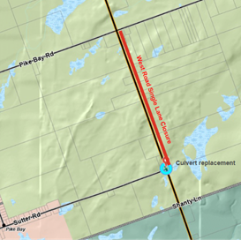 A single lane closure will be in place on West Road between Sutter Road and Pike Bay Road, west of Pike Bay, on Thursday, September 18, 2025, from approximately 6:30 a.m. until 5 p.m. for culvert replacement, weather permitting.